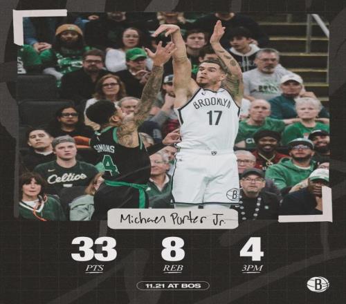 自從離開掘金,很少看到小邁克爾-波特的新聞。其實(shí)他最近打得不錯(cuò),過去8場(chǎng)比賽,小波特在籃網(wǎng)場(chǎng)均砍下27.8分7.5籃板3.3助攻,投籃命中率50.3%,三分命中率40.6%。賽季至今,小波特打了14場(chǎng)比賽,其中5場(chǎng)砍下30+!