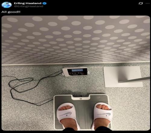 作為回應(yīng),曼城前鋒哈蘭德在社交媒體上發(fā)布了一張自己站在體重秤上的照片,并配文“一切都很好?。 ?/p>